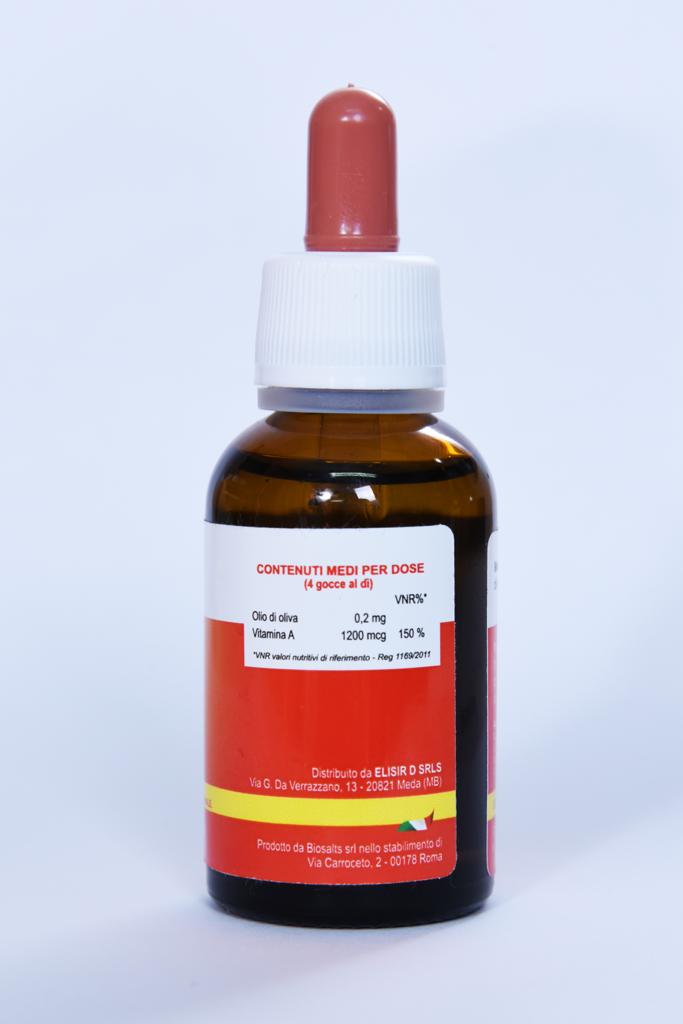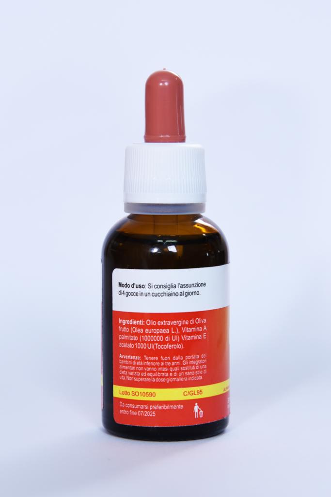Olio extra vergine di oliva frutto (Olea europaeaL.), Vitamina A palmitato (1000000 UI), Vitamina E acetato (1000 UI) Tocoferolo.